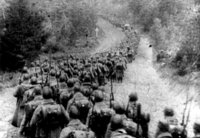 After the bend was a long, straight stretch of road. The 200 or so yards directly in front of us were deserted; the straggling groups that we had been accustomed to see in front of us had all merged into a single, stationary horde standing far down the road.[…] From near this knot of men the voice continued its resonant, unintelligible address. Behind the men we could see a long file of military trucks and tanks on the road, but we could not tell of what nationality they were.
